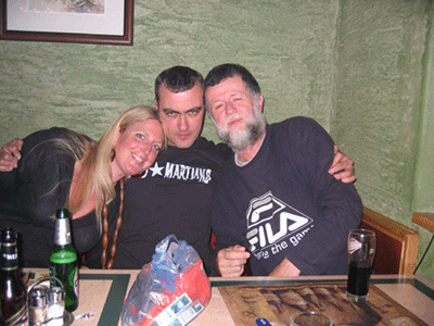 Neki ogromni ćelavac mlati sa druge strane bine, iz prvog reda sa policijskom značkom. D. mu je uzima na šta ovaj pošizi i nekako uspeva da se dokopa svoje značke. Odlazim do čika Pere, bivšeg boksera, a sada izbacivača i kažem mu da imamo problem. Sa neskrivenim zadovoljstvom polazi da sredi stvar jer sam ga ulovio u trenutku dok mu se šofer Mija unosio u lice i pričao mu jednu od milion priča koje sam već naučio napamet. Ćelavca više nema, koncert se bliži kulminaciji. Na kraju D. seda za bubanj, Dave uzima njen bas i kreće Have A Love Will Travel. Totalno ludilo u prvim redovima. Ekipa iz Novog Sada je u transu. Mlađa peva sa Muffy, ostali Novosadisti prave dobru atmosferu. Krajičkom oka snimam da se ćelavac vratio u klub i da skenira unaokolo ne bi li me našao. Sreća da se koncert završava, pa ih ispratim do backstagea i stanem ispred vrata da se neko ne napravi pametan i pokuša da uđe dok se presvlače. Naravno, takav se uvek i svuda pojavi, pa i u Somboru. I to baš ortak ćelave gromade koja je pre samo 20-ak minuta na smrt isprepadala bend. Krene za kvaku, ja ga ćapim za ruku i kažem: "Gde si, bre, pošao?". Reče da hoće da ih fotografiše. Kažem mu da se strpi 10 minuta. Odlazi, ali znao sam da će da se vrati i znao sam da neće da bude sam. Nisam još stigao ni pivo da naručim, kad evo ga sa glavonjom. Pita me glavonja: "Si ti taj iz Beograda?". Kažem: "Jesam". Rekoh sebi - gotovo je, sad će da me ispegla. Bar da imam neki bokser ili nož, u pizdu materinu! Međutim, gromada kreće sa pričom kako mu je žao, kako nije mislio ništa loše, kako je on cool cop, sluša Napalm Death (serem ti se u izbor, mislim se!!) itd. Samo je hteo da se fotografiše sa celim bendom i ništa više. Pade mi kamen sa srca jer, iskreno, sve što sam očekivao bila je tuča u kojoj baš nisam imao nikakvih izgleda. Rekoh mu da ću sada da uđem kod njih i da ću da im objasnim da treba da se slikaju sa njim. Ostavljam ga nasmejanog, ali niko nije nasmejaniji od mene.